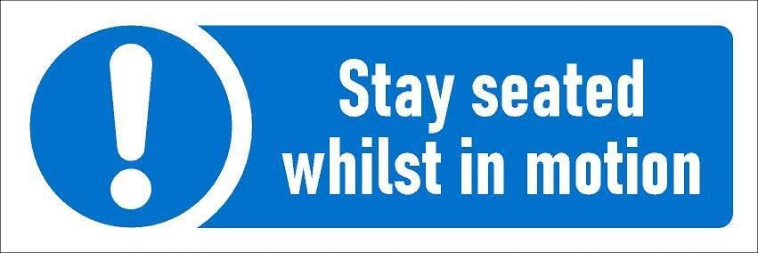 Stay seated whilst in motion, safety sign - Self adhesive sticker (150mm x 50mm)