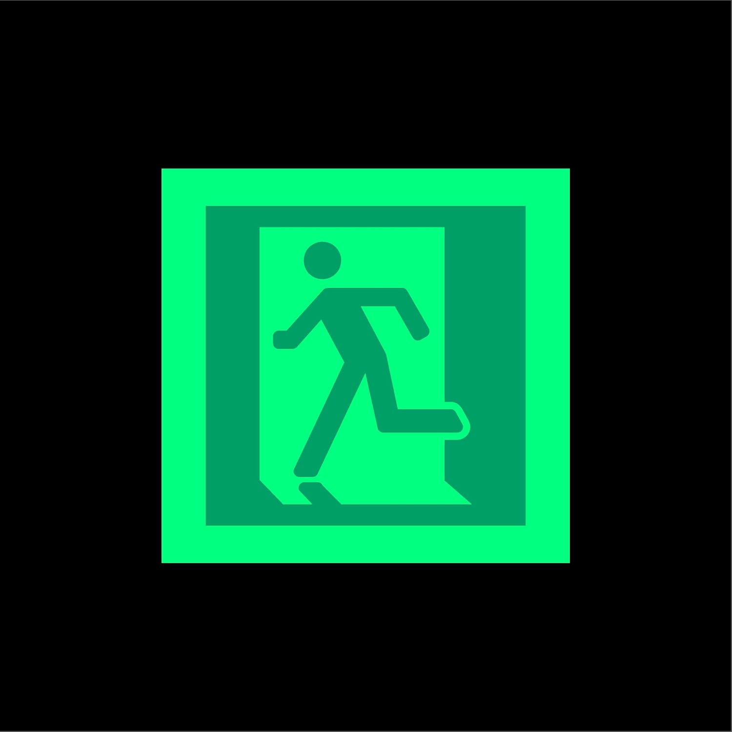 Fire exit running man left safety sign - 100mm x 100mm 1.2mm Photoluminescent glow in the dark rigid plastic with self adhesive backing