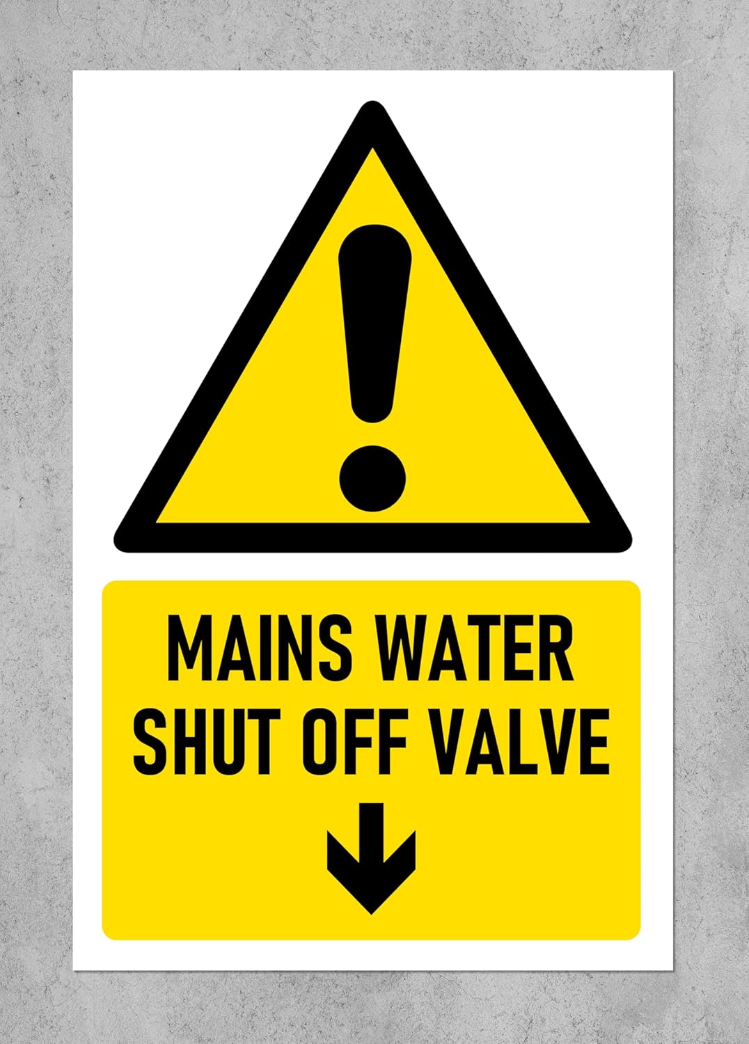 Mains water shut off valve, arrow pointing down, safety sign - Self adhesive sticker (200mm x 150mm)